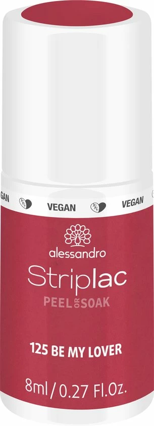 Striplac Peel or Soak van Alessandro is een innovatie in de nagelcosmetica. Met slechts twee lagen, een laag kleurlak en een laag top coat, heb je in slechts een paar minuten een perfect glanzende gelmanicure die tot wel 3 weken houdt. Hoewel de gelmanicure zeer langhoudend is, is deze zonder moeite te verwijderen waar en wanneer je maar wilt. Je ?peelt? of ?soakt? deze er simpelweg af zonder restjes op de nagels achter te laten.