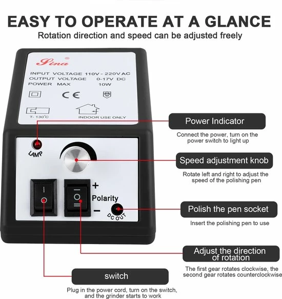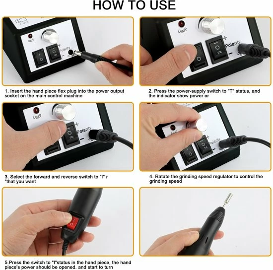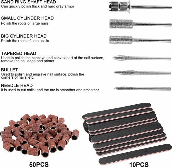 Specificaties: – Traploze aanpassing van de snelheid. – Zeer licht ergonomisch handstuk voor nauwkeurig werken. – 500 tot 20.000 toeren per minuut. Metalen vijl: Verwijdert dode huidcellen, likdoorns en eelt Slijpvijl: plat en glad voor extra dikke nagels en geribbelde oppervlakken Kleine vijl:vijlt in hoeken en moeilijk bereikbare plaatsen Zachte vilt kegel: Polijst denagels vooreen gezonde glans. Stimulereert het nagelbed voor betere groei van de nagel Vlakke vijl: Voor het egaal vijlen van de nagels