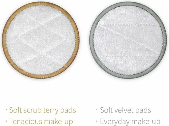 De set bevat 12 zachte pads en 4 scrub-pads voor het verwijderen van make-up. De scrub-pads zijn perfect voor het verwijderen van hardnekkige producten en het scrubben van de huid. De zachte pads zijn daarentegen geschikt voor de gevoelige huid rondom de ogen en het reinigen van dagelijkse make-up. Deze herbruikbare wattenschijfjes staan iedere dag voor je klaar om je make-up zacht en doeltreffend te verwijderen.