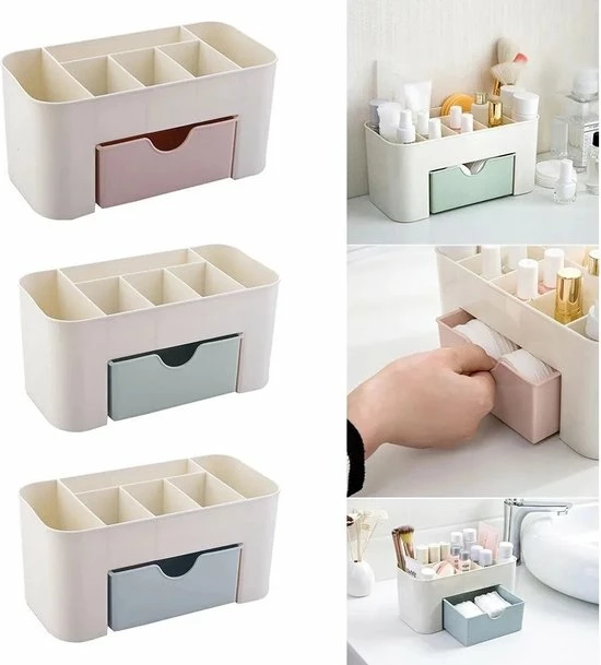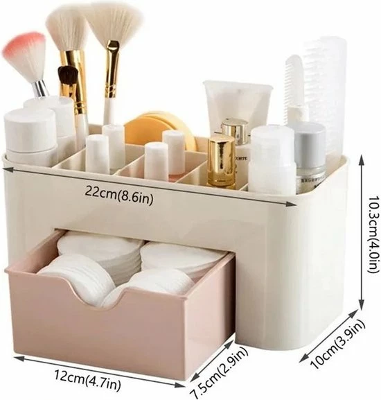 Berg voortaan al jouw cosmestica spullen zoals je kwasten, make-up, sieraden, etc. op in deze handige opbergdoos! Met het compacte ontwerp neemt hij niet veel ruimte in in je kamer en past hij bij elk interieur! De doos beschikt over verschillende vakjes waar je dingen in kunt zetten en een handige lade voor andere spulletjes.