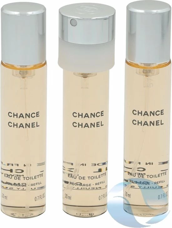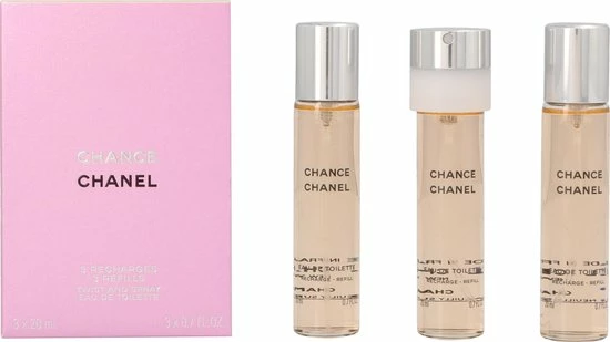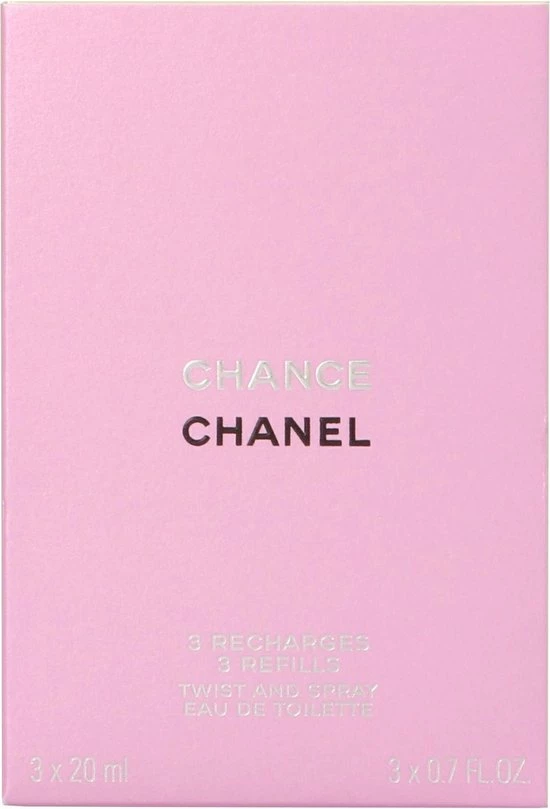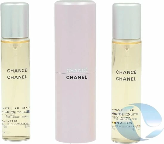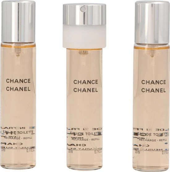 Geschenkset met twee navullingen. Chance van Chanel is een moeilijk te omschrijven geur omdat hij van alles wat heeft. Het ruikt sensueel, een tikkie kruidig maar tegelijk ook bloemig, zoet en fris. Dit komt door ingredi?nten als jasmijn, hyacint, roze bessen en patchoeli-amber.