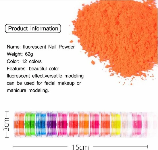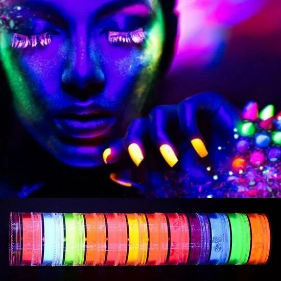 De neon oogschaduw licht perfect op onder blacklight tl-lampen of UV-lampen en komen zo optimaal tot hun recht, voor langdurig en intensief gebruik. Het poeder is ook te gebruiken voor acryl nagels.