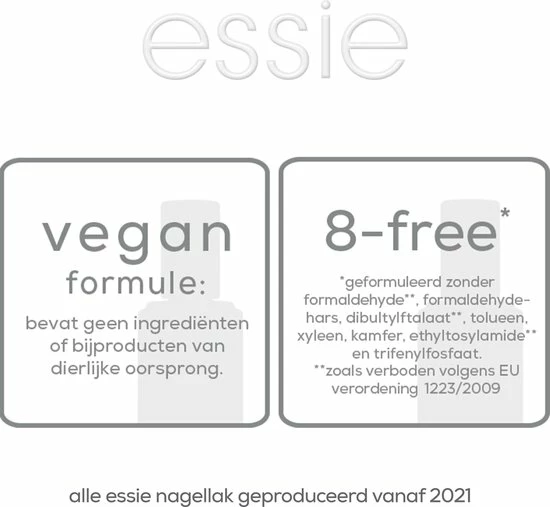 essie’s stap voor perfecte TREAT LOVE & COLOR™ manicure Stap 1: Breng essie TREAT LOVE & COLOR™ op de nagel aan met lange, soepele bewegingen. Er is geen top coat en geen base coat nodig voor een ultrasnel resultaat. essie is opgericht uit liefde voor de manicure ervaring en de wens deze te delen met elke vrouw. zo kan elke vrouw een manicurestijl vinden die haar aanspreekt voor haar @home nagelstudio. het succes van essie bestaat uit de combinatie van professionele kwaliteit met trendy producten en onvergetelijke speelse namen. essie is dan ook vaak te vinden op catwalks over de gehele wereld waarbij de trendy nagellakcollecties trends inspireren, seizoen na seizoen. essie blijft werken aan haar nagellakformules om deze voor mens en dier te verbeteren, zo is elke nagellak die na 2021 is geproduceerd vegan & 8-free. essie loves all!