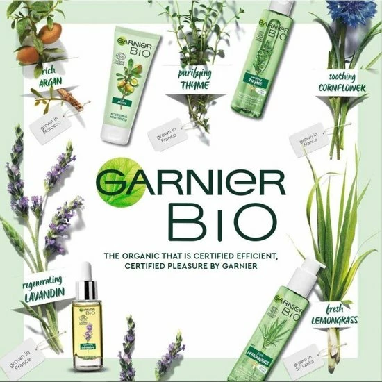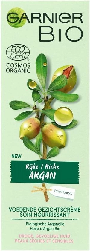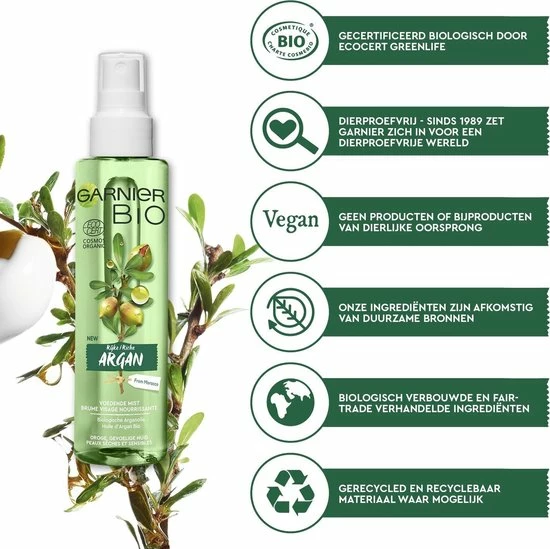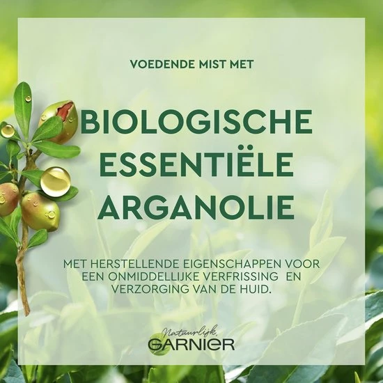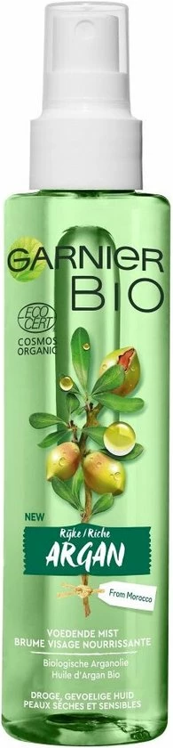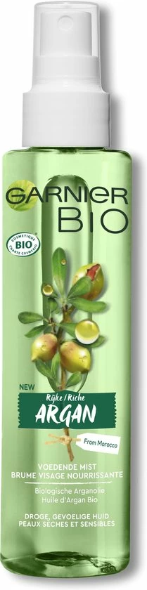 De Garnier Bio Voedende Mist stelt de rijke eigenschappen van Argan centraal. De biologische Arganolie is met respect voor de natuur op duurzame wijze verbouwd in Marokko en heeft een heerlijke, warme geur. Omhul je in de aromatische geur die een orintaalse, houtigachtige basis perfect combineert met een zoet hart van argannoten en frisse, bloemige topnoten. Verstuif de voedende mist over het gezicht voor een extra stap hydratatie, vr het aanbrengen van de Garnier Bio Argan Gezichtscrme. Vermijd de oogcountouren. Geschikt voor de droge, gevoelige huid.