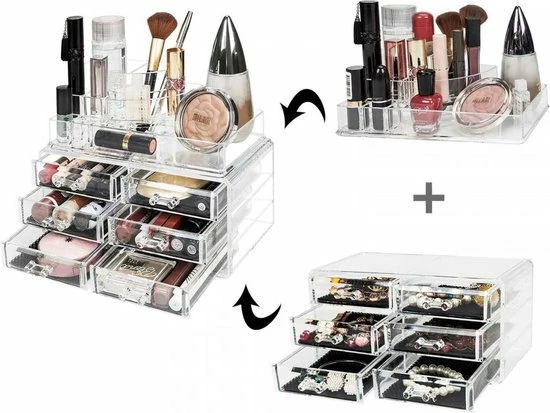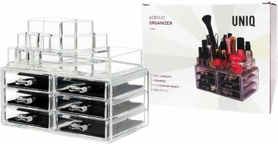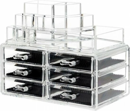 Nu kunt u al uw make-up gemakkelijk en eenvoudig organiseren met deze fantastische make-up organiser. Het bovenste gedeelte is speciaal onderverdeeld in compartimenten om plaats te bieden aan vele items. En in het onderste gedeelte met 6 lades kunt u uw make-up of sieraden indelen voor eenvoudig gebruik. Met deze cosmetica organizer kunt u uw make-up accessoires netjes en goed georganiseerd bewaren.