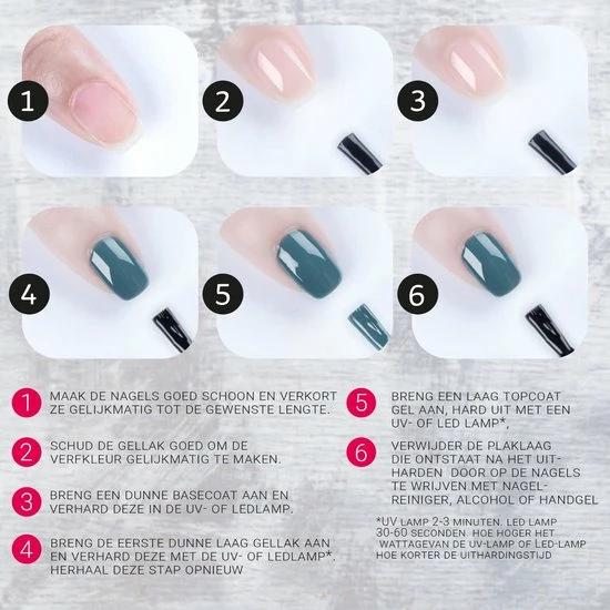 De nagellak is een soak-off gellak en wordt uitgehard door middel van een UV of LED lamp. Hoe hoger de wattage van lamp, hoe korter de uithardingstijd. Een LED lamp heeft meestal de kortste uithardingstijd. Voor een perfect en zo langdurig mogelijk resultaat adviseren wij om gebruik te maken van een Top- & Base Coat gel. Zo geniet je 2-3 weken van mooie en verzorgde nagels.