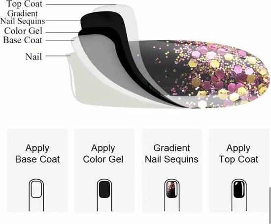 Het aanbrengen van deze Glitter Poeder is erg eenvoudig. U kunt dit met een dun penseel doen, met een kwastje, met een dotting pen, maar natuurlijk ook met andere tools. Met een Base en een Top Coat kunt u deze schubben al super mooi aanbrengen. Wilt u dit op een kleur hebben, bijvoorbeeld op Gellak, nagellak of Acry? Dit kan ook!