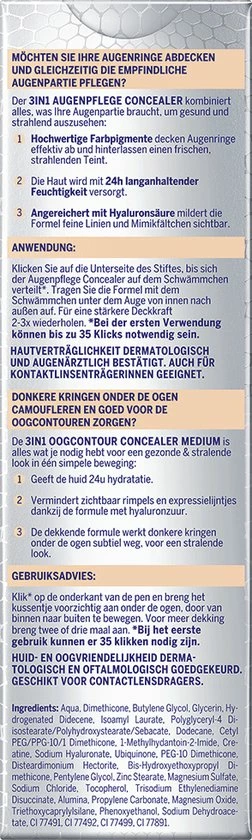De formule verrijkt met hyaluronzuur activeert huidcellen om hun eigen hyaluronzuur te produceren*. De oogconcealer geeft je huid met elke applicatie 24 uur hydratatie, voor een fris uitziende huid. Hij werkt pigmentvlekjes subtiel weg en benadrukt je jonge en stralend uitziende zelf zonder maskereffect.