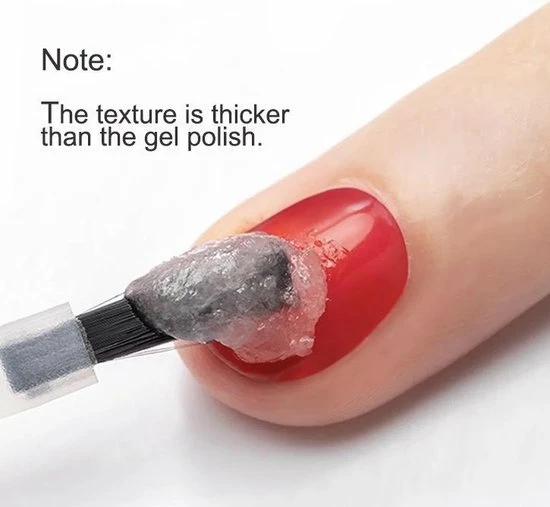 Wacht niet meer tot de gelpolish op de nagels van je tenen of vingers afgeweekt is. Met deze handige gellak remover set bespaar je heel veel tijd. Verwijder eerst de toplaag met een grove gritvijl zodat de substantie makkelijk inwerkt. Breng vervolgens een dikke laag remover aan. Wacht 5 tot 8 minuten. Wanneer de gel bubbelt gaat het de goede kant op. Als het bubbelen gestopt is verwijder je de overgebleven gellak van de nagel met het bokkenpootje. In minder dan 10 minuten heb je de gelpolish verwijdert, zonder schade te brengen aan de natuurlijke nagel.