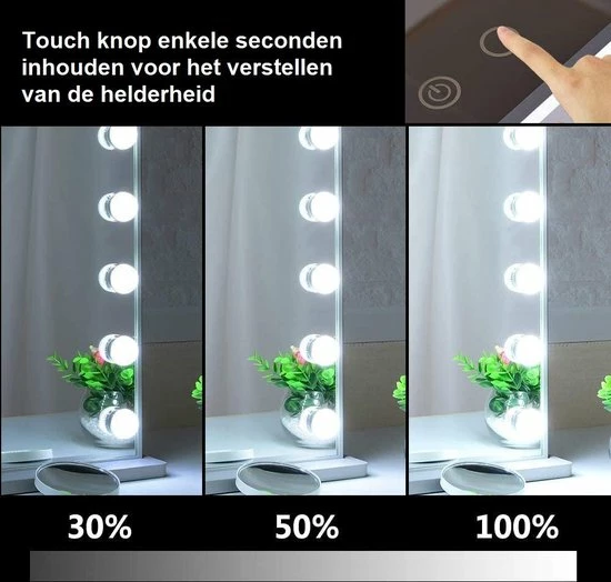 Je kan de spiegel bevestigen aan de muur of zetten op een kaptafel of bureau door middel van de basis die wordt meegeleverd. Met de TOUCH knop geïntegreerd in de spiegel kies je voor het aanzetten of dimmen van je verlichting.